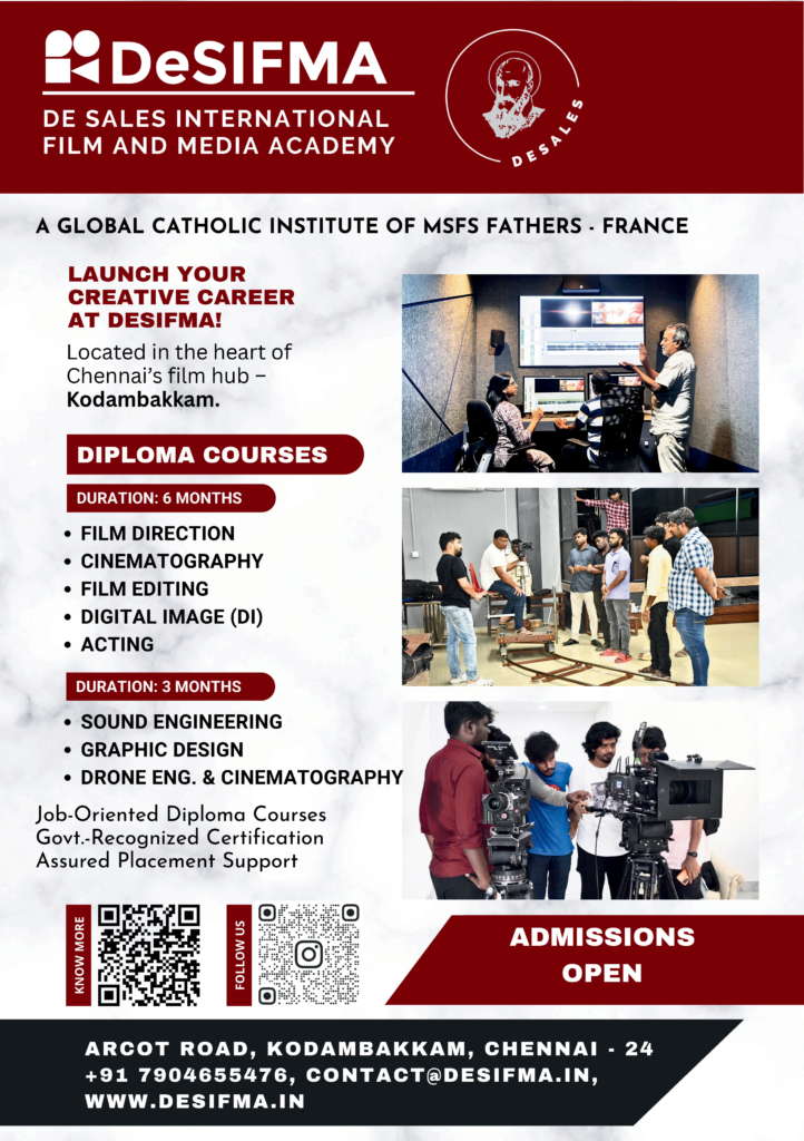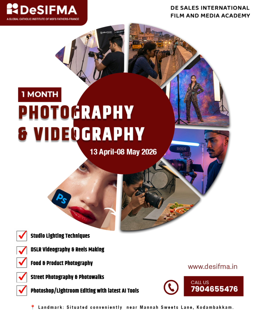 De Sales International Film & Media Academy (DeSIFMA) is a premier film and media institute managed by the Catholic Missionaries of St. Francis de Sales (MSFS Fathers, France). Located in Kodambakkam, Chennai, the academy is recognized as a leading institute in the region, offering industry-focused training supported by modern infrastructure, professional equipment, and a creative learning environment that prepares students for real-world media careers. Its distinctive curriculum — including photography, videography, studio lighting, film production, and emerging AI-integrated media modules — is designed to bridge artistic vision with practical expertise, setting it apart from conventional institutions through hands-on learning and professional mentorship.